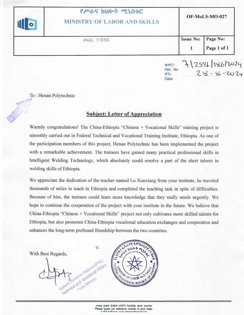 近日,两封来自埃塞俄比亚的感谢信,寄送到了437ccm·必赢国际。感谢的对象是学校和该校老师鲁训祥。在今年中埃“中文+职业技能”执教活动中,鲁训祥承担着智能焊接模块的教学工作,近俩月时间里,他悉心教导、倾囊相授,和39名非洲学生建立下深厚情谊。