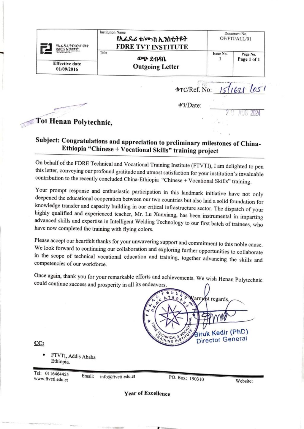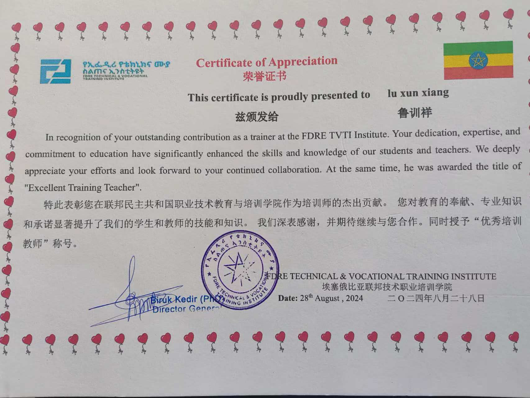 援非结束后,鲁训祥被授予“优秀培训教师”称号,鲁训祥很珍惜这个荣誉,“这是学生自己评选出来的,是对我最好的认可。”今年8月底,又有两封感谢信,从埃塞俄比亚传来,对河南职业技术学校提供的帮助给与高度评价,对鲁训祥勤勉教学给与盛赞。